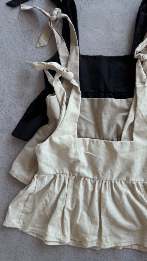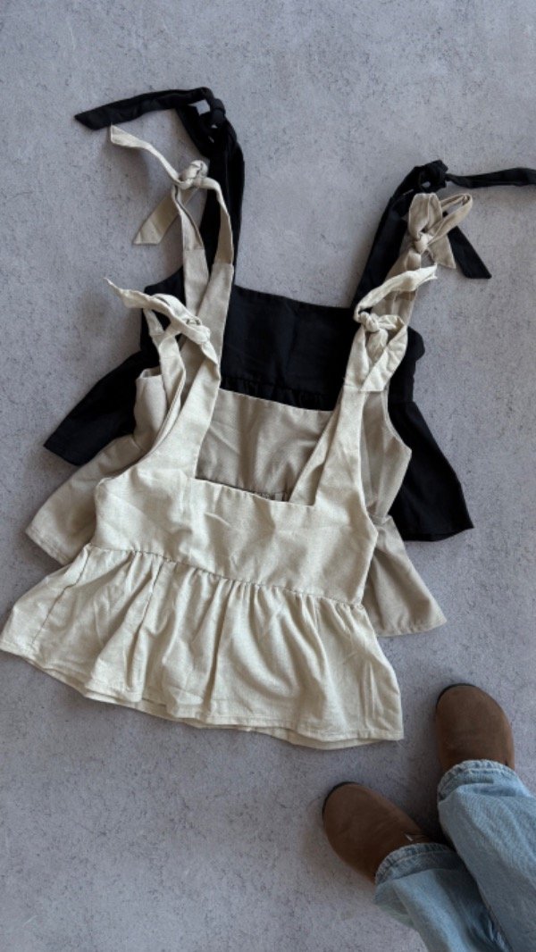 musculosa de lino con breteles para atar, larga a la cadera aprox.