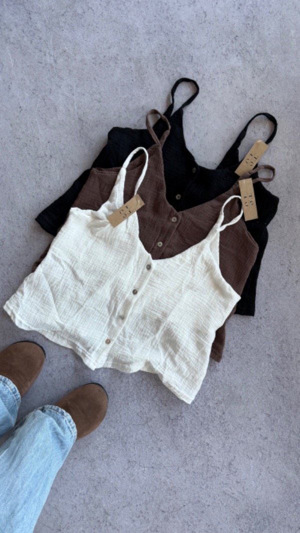 musculosa de lino con botones y forro en el pecho, larga a la cadera aprox.
