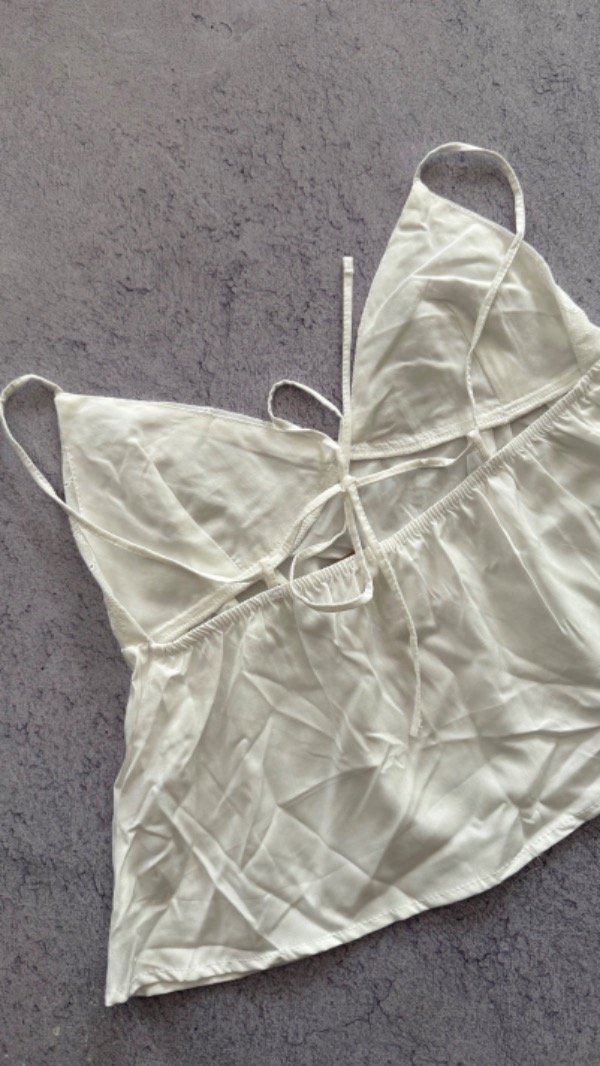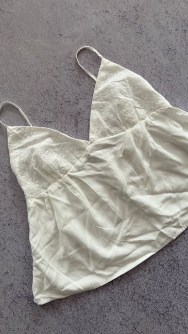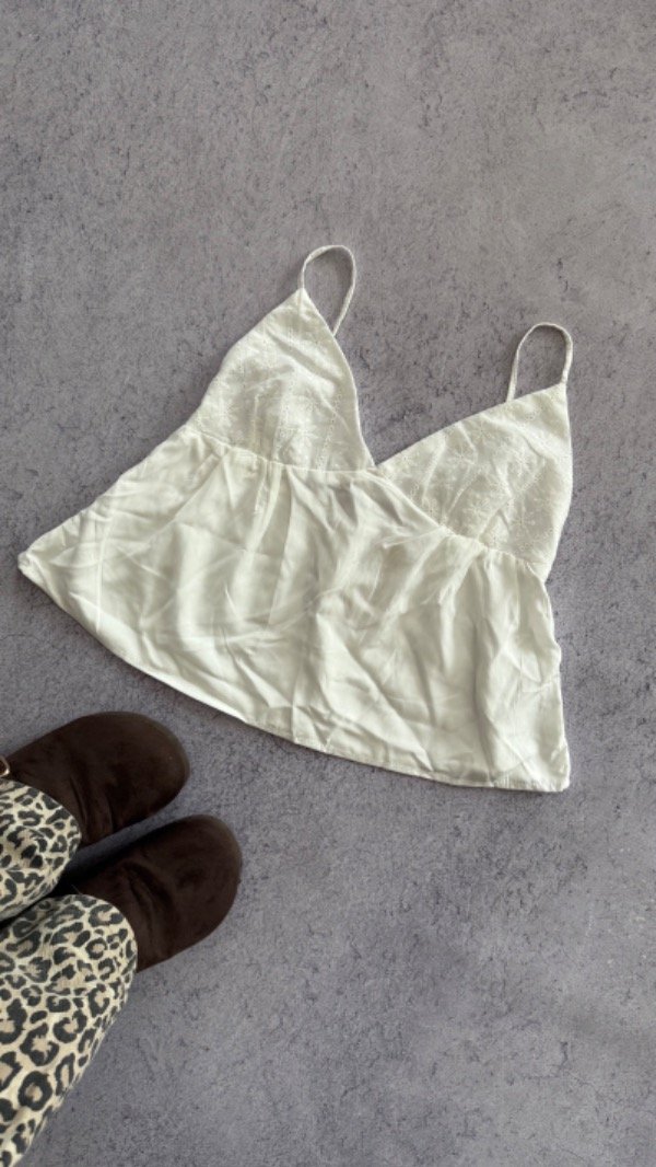 musculosa de fibrana liviana, con brodery en el pecho, larga arriba de la cadera aprox.