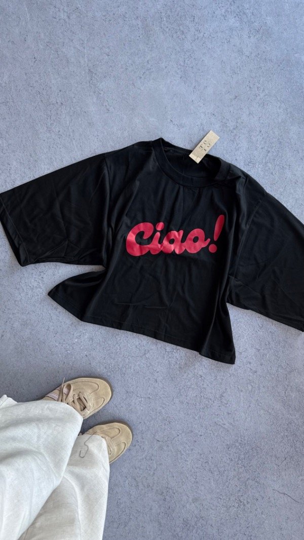 Remera corta de algodon con estampa, modelo boxy con manga casi al codo. Talle unico, se adapta hasta un XL aprox