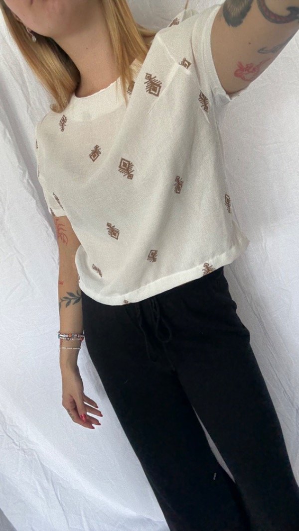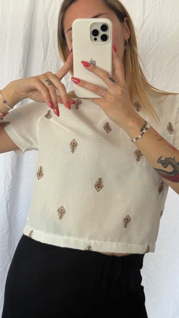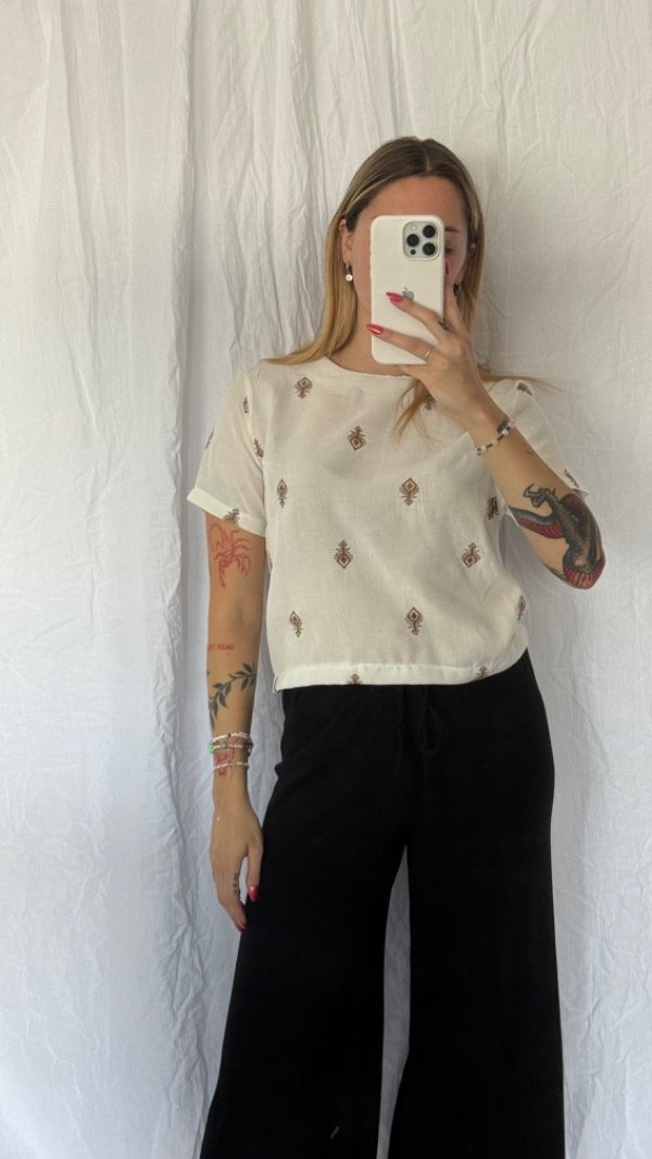 Remera bordada de lino. es corta entre la cintura y la cadera