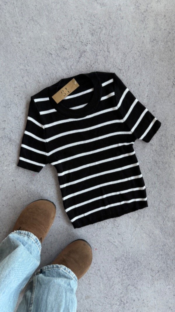 Remera rayada de hilo, manga corta. elastizada, es larga a la cadera aprox. talle unico, va para S/M