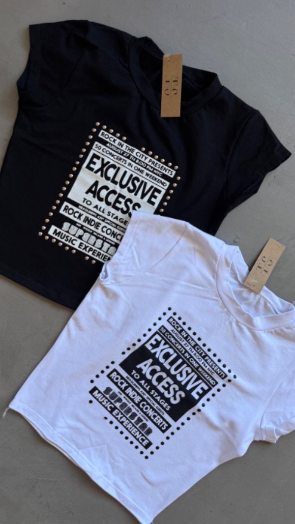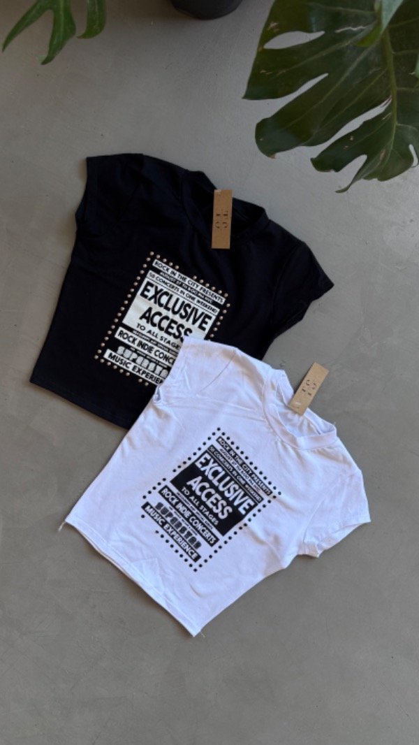 Remera crop de jersey con estampa y tachas pegadas, elastizado.
