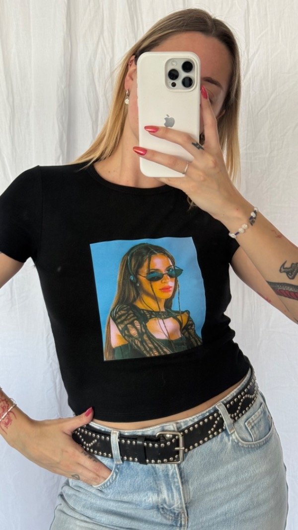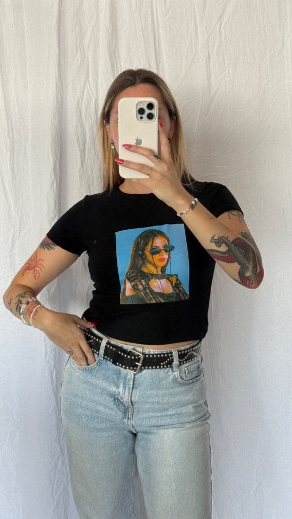 Top de ribb con estampa, elastizado. largo a la cintura.