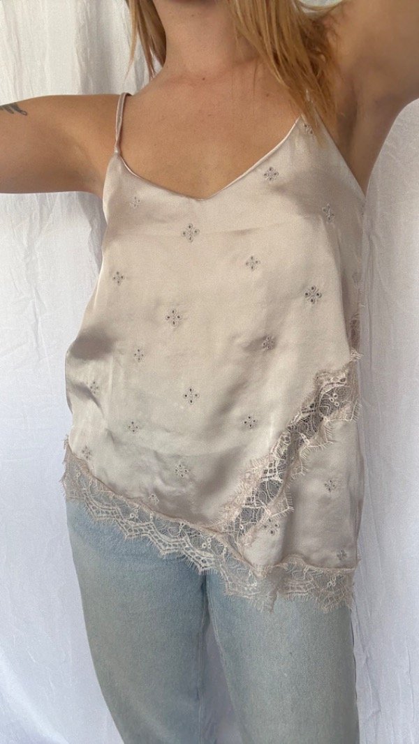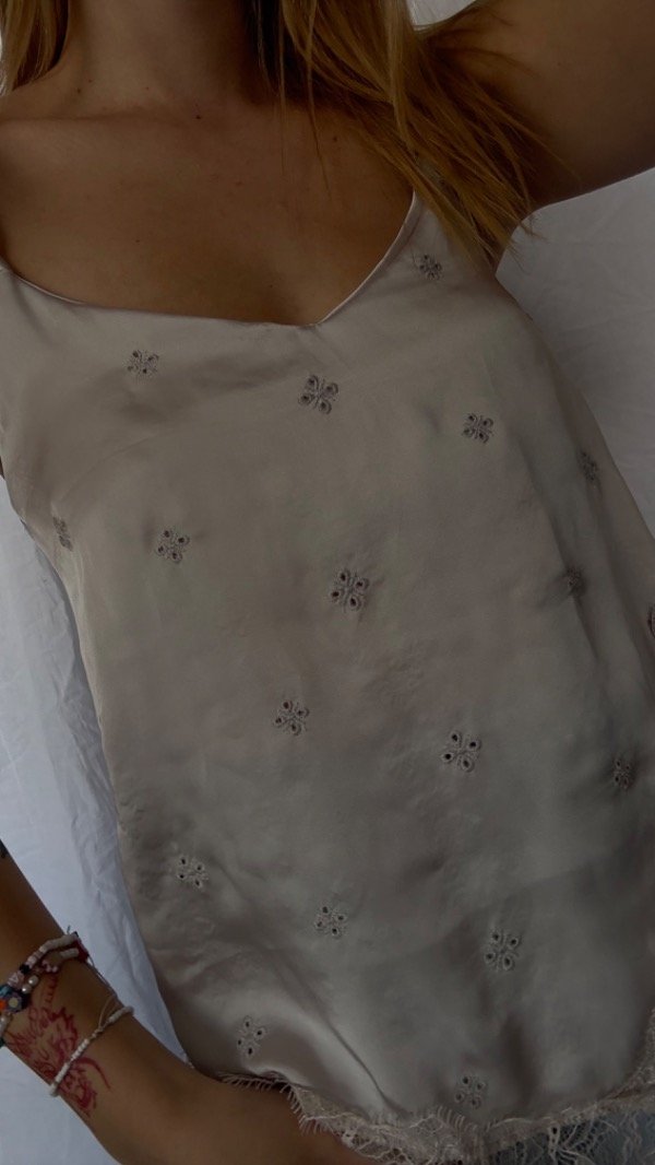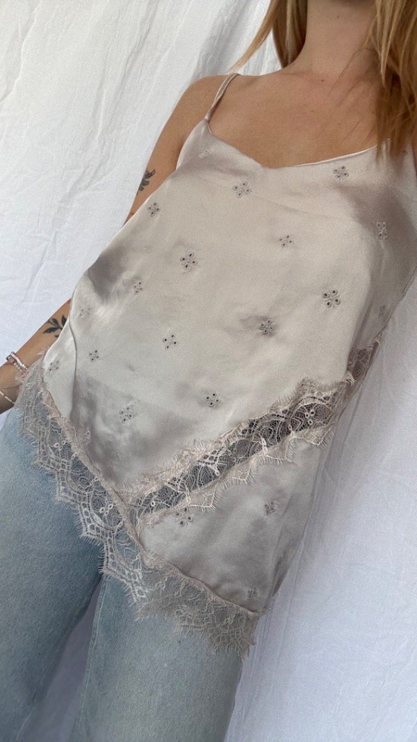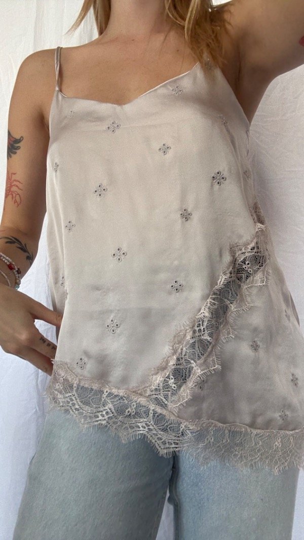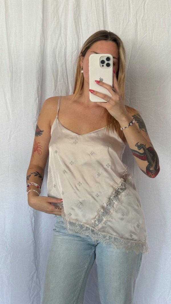 musculosa de gasa con bordado, largo irregular combinado con encaje. talle unico aprox S/M