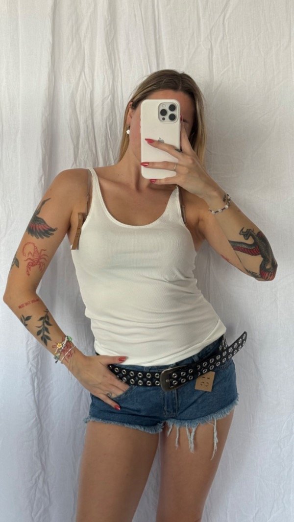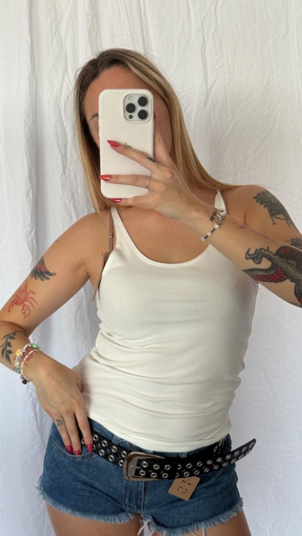 musculosa lisa de morley con bretel fino. corto entre la cintura y la cadera aprox, es elastizada.