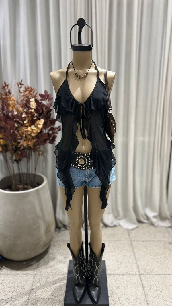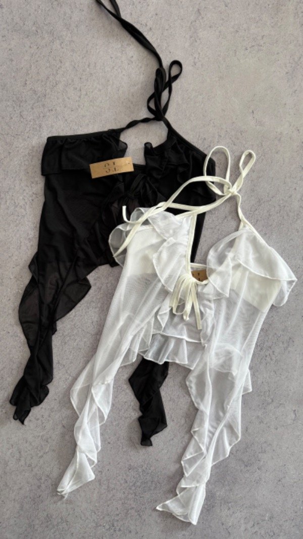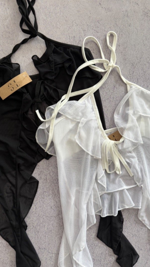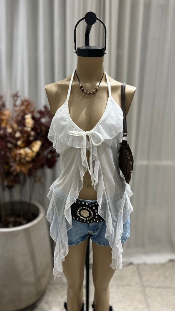 top de encaje con volados y forro en tazas, espalda descubierta. talle unico aprox S/M