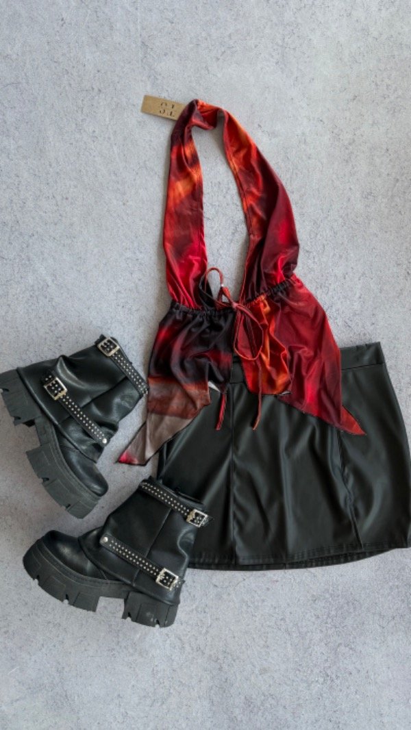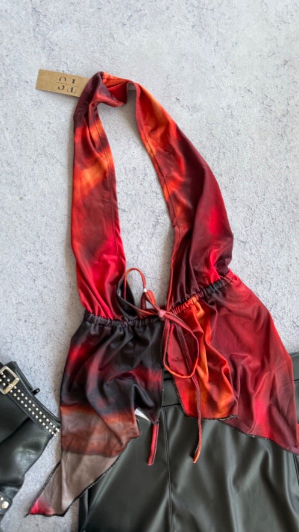 top de microfibra estampada sin espalda, corte irregular. talle unico aprox M