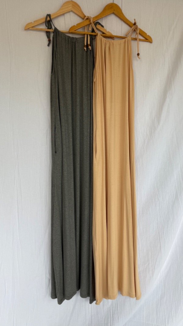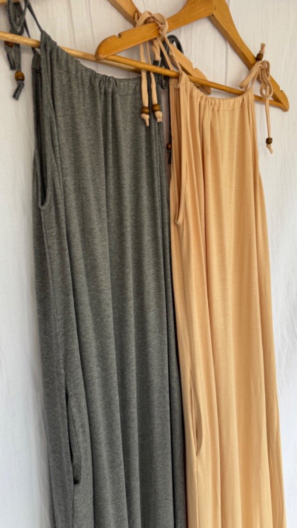 vestido largo de modal con escote regulable, es elastizado y trae bolsillos. talle unico aprox M/L