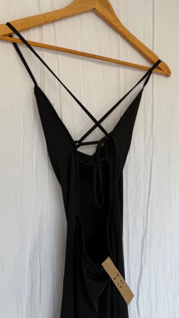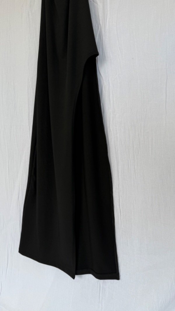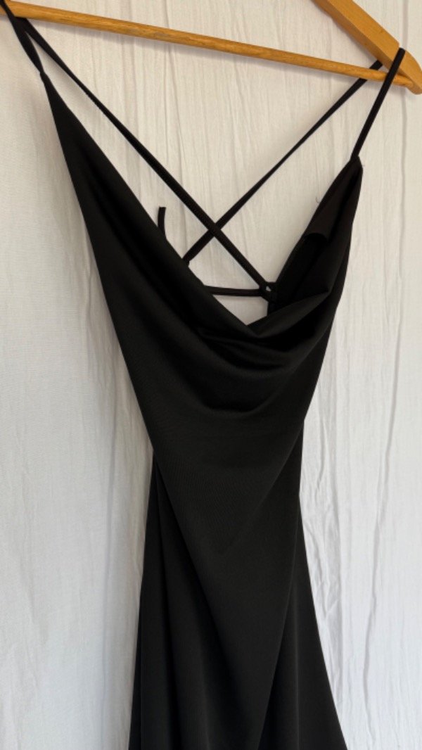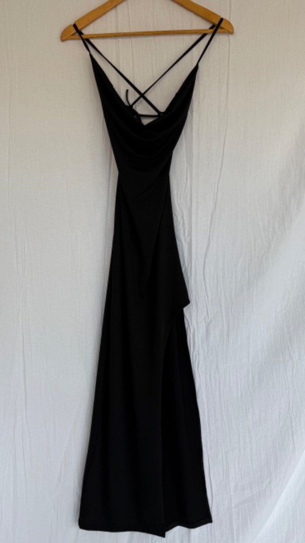 vestido largo de microfibra con escote buche, espalda descubierta y tajo en un lado, es elastizado. talle unico aprox S/M
