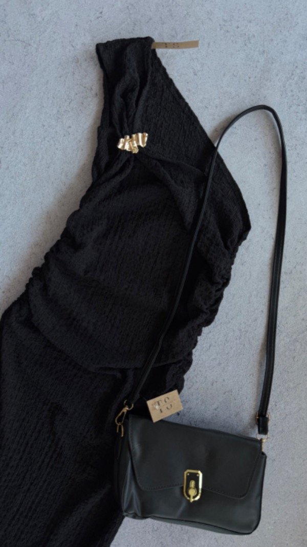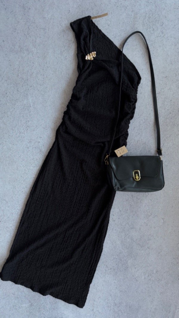 vestido largo a un hombro, de bambula. con tajo en un lado y hebilla de metal. es elastizado. talle unico aprox M