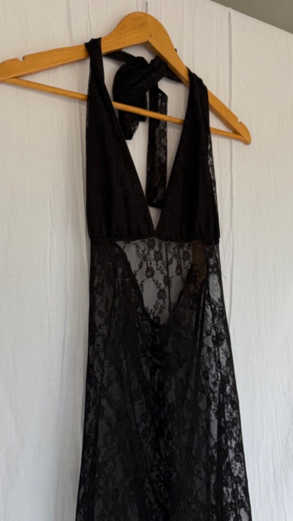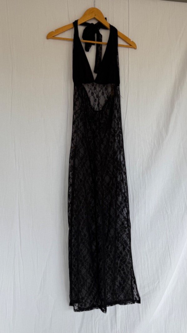 vestido largo de encaje con forro en el pecho, tiene un tajo a un lado. es elastizado. talle unico aprox S/M